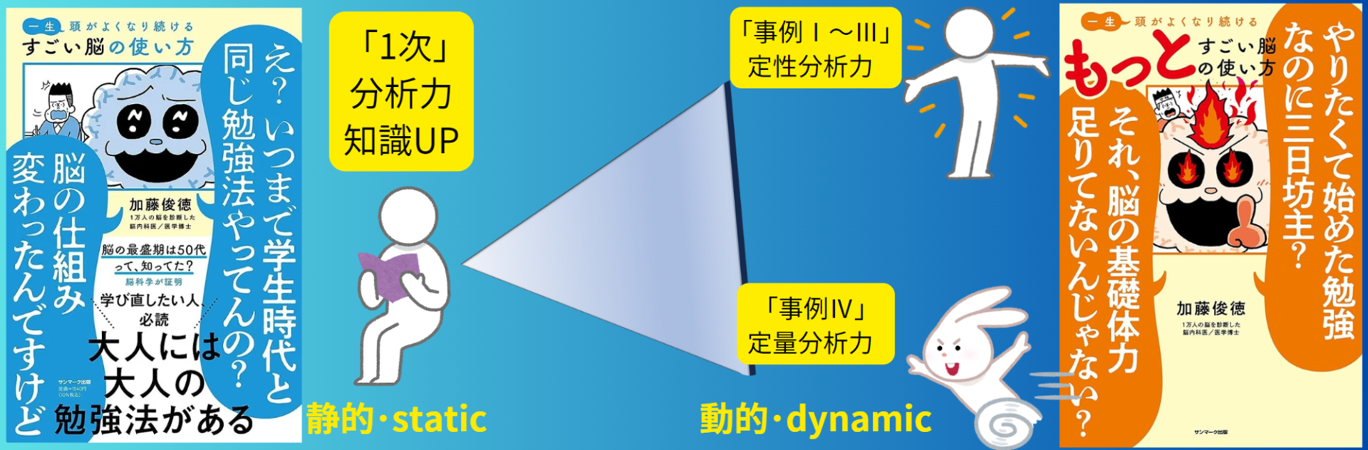 この2冊セットの隠れた利点は、「頭が良くなる」の前に【一生】がつく。つまり長期記憶で脳の神経細胞を発達させると、できることが次々に増え【一生賢く】なれる。