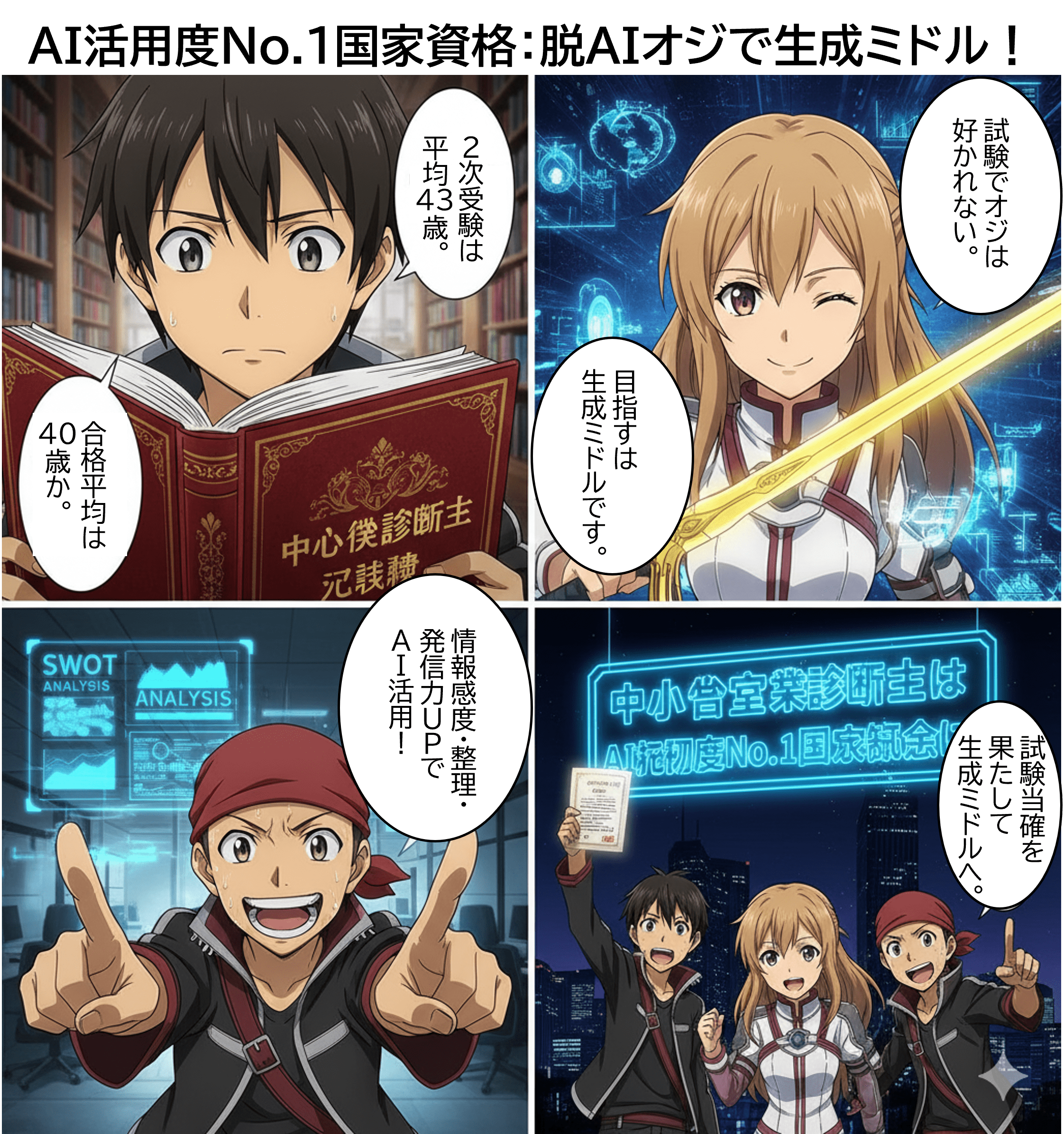 中小企業診断士は、他の士業に先駆けて生成AIを活用する「生成AI活用度No.1国家資格」として、日本の未来、特に中小企業の成長を牽引することを力強くアピールし、いよいよ本試験に向かいます。