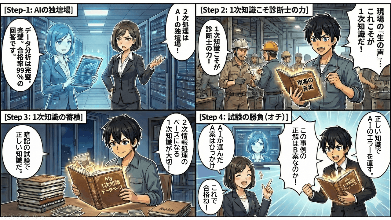 2次情報処理が生成AIの独壇場になるほど、その前工程の1次データ収集や、AIの正誤を判定する「正しい1次知識」が重要に。この流れを掴めばこれからの試験で勝てます。