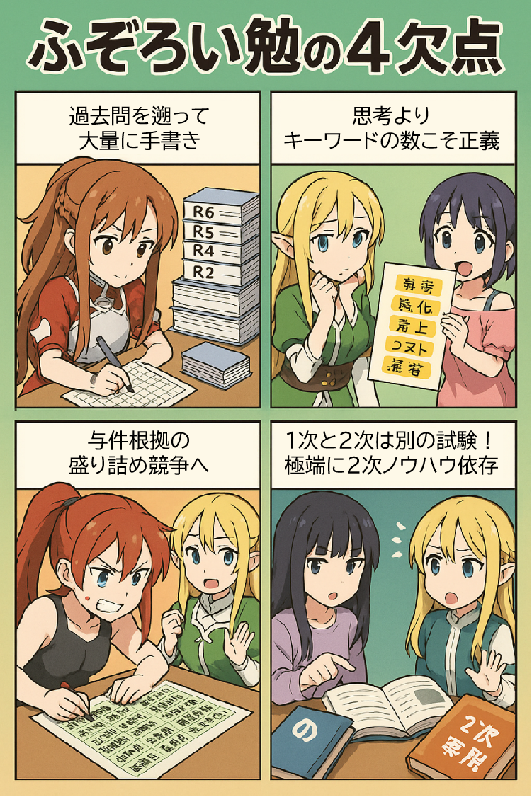 R6→R2の順に、過去問をひたすら100字マス目で解きまくる。「量をこなすことが正解」と誤解し、設問趣旨の違いや年度別の出題傾向を無視してしまう。