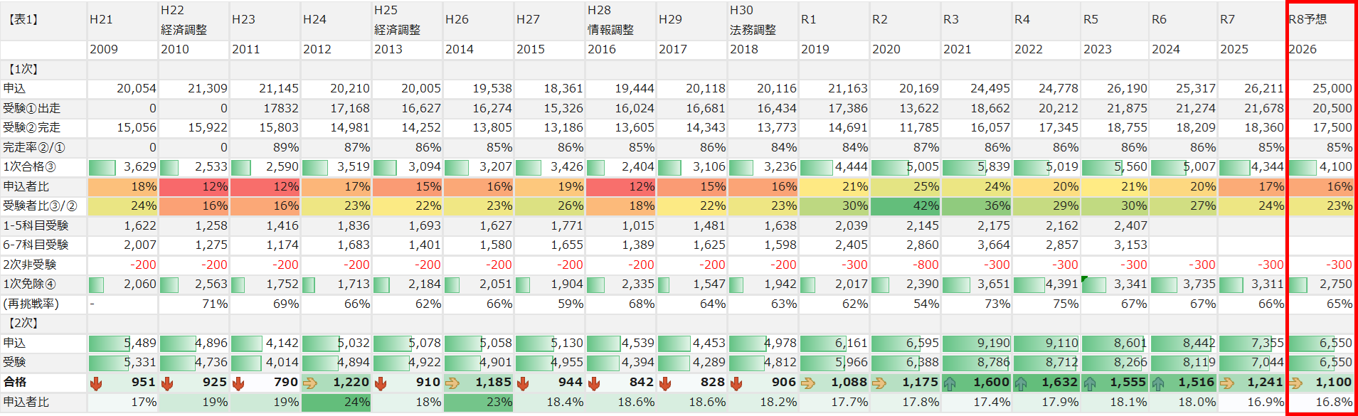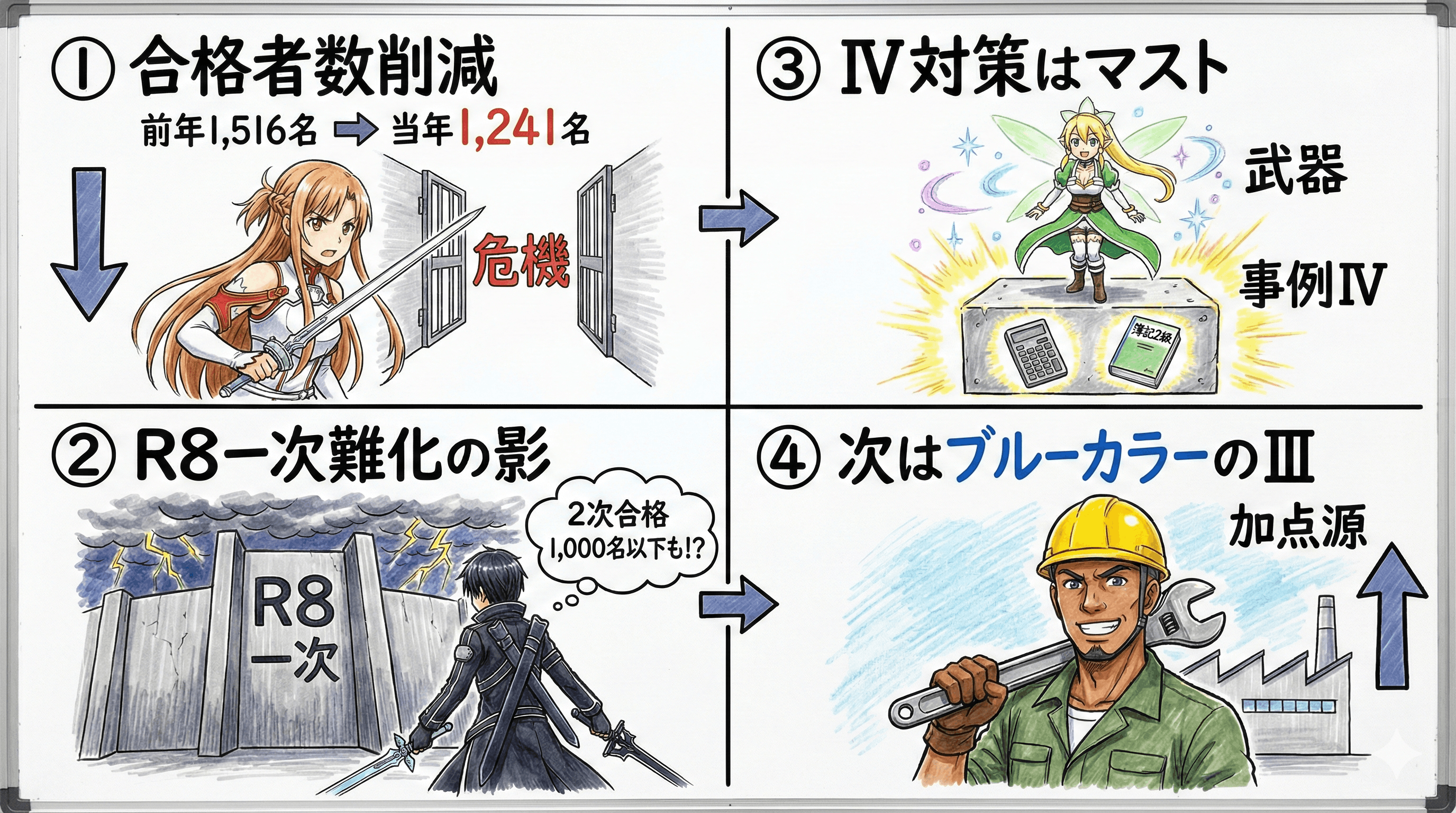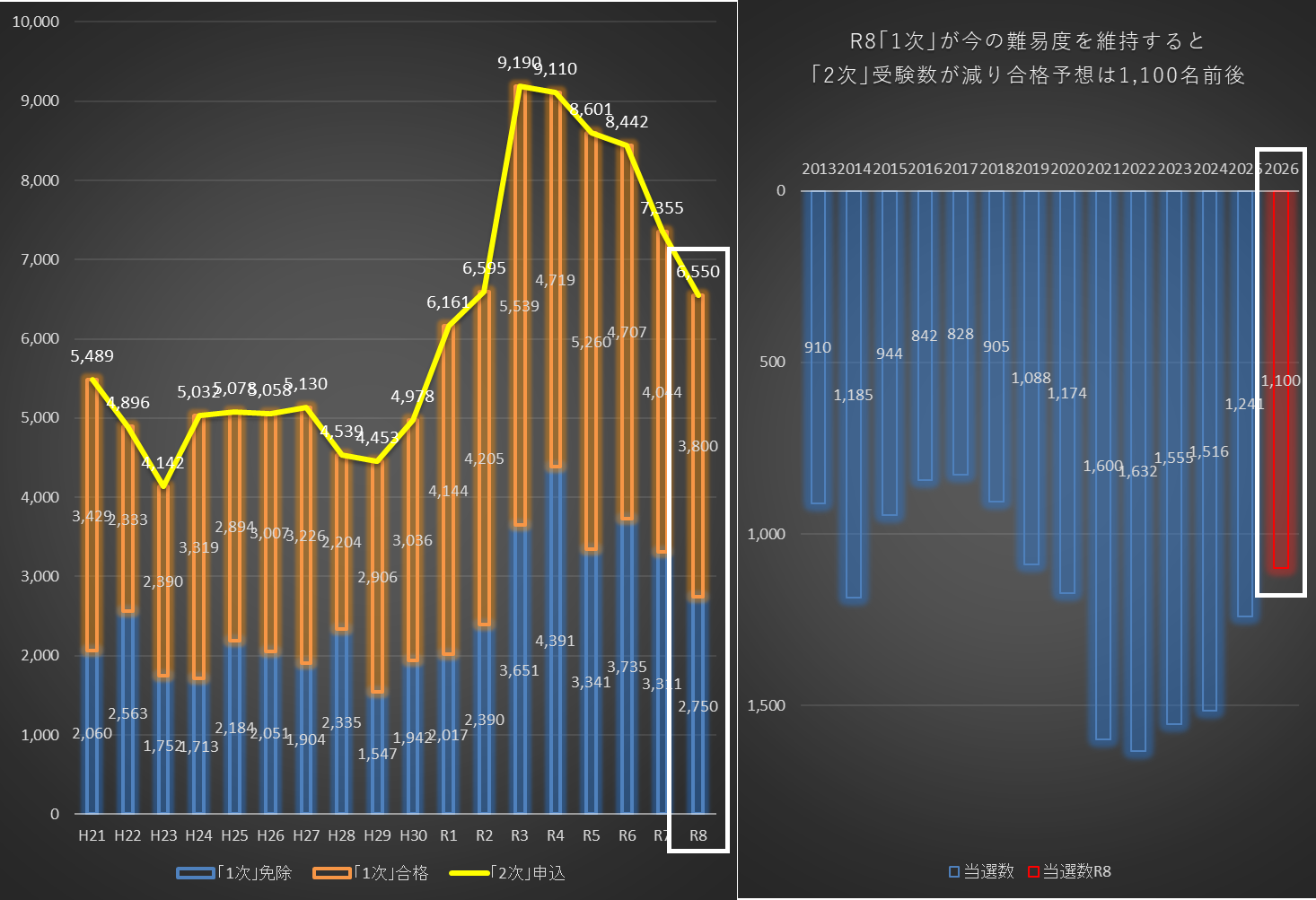 令和8年の一次試験が難化傾向を示せば、その波及効果で母集団が減少し、二次合格者数が1,000名を割り込む事態も想定されます。