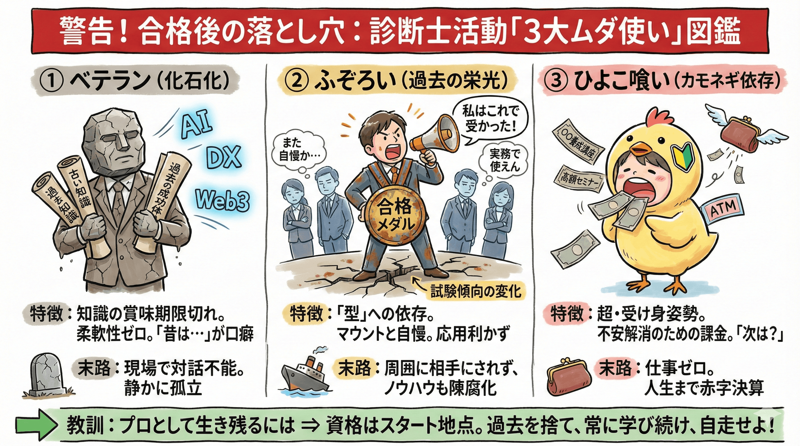 特定の受験テクニックを絶対解と信じて合格した結果、その狭いノウハウこそが全てだと勘違いし、実務で全く通用しない「裸の王様」になっている。