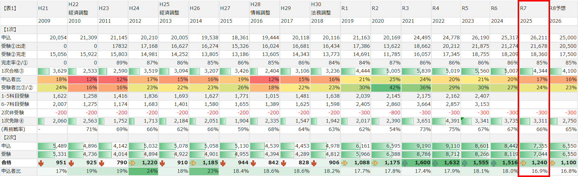 試験申込数・合格数・合格率の推移~「2次」1,600名バブル合格時代が終わり、「量より質」が示され、R8試験は「1次」の難化次第で「2次」合格1,000人割れも
