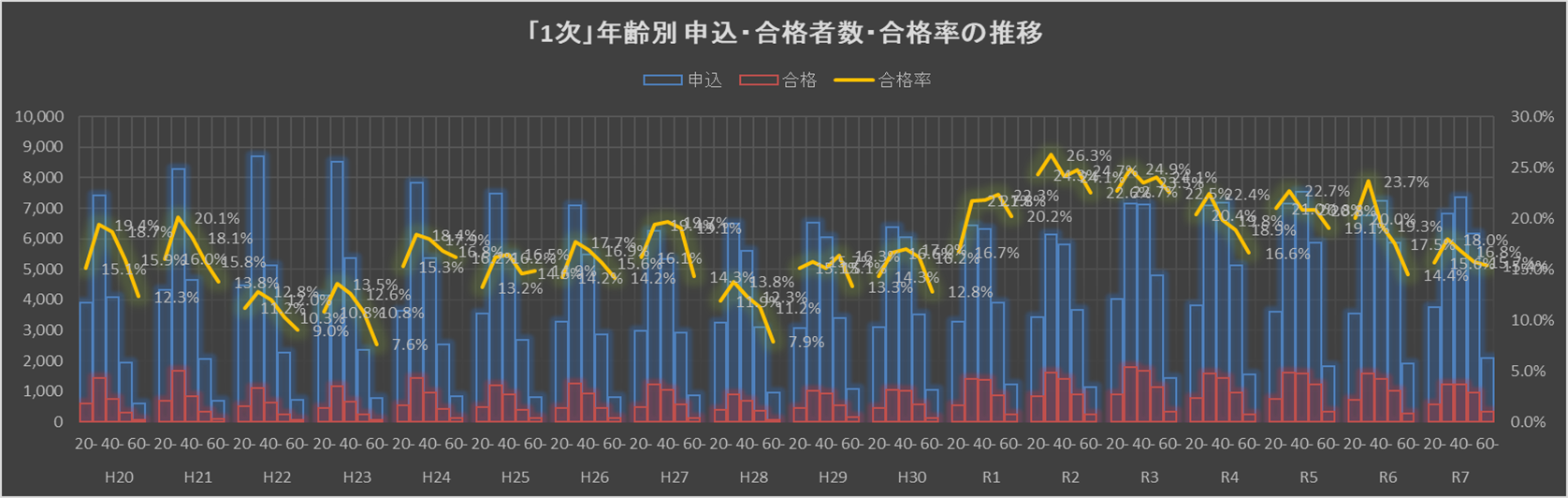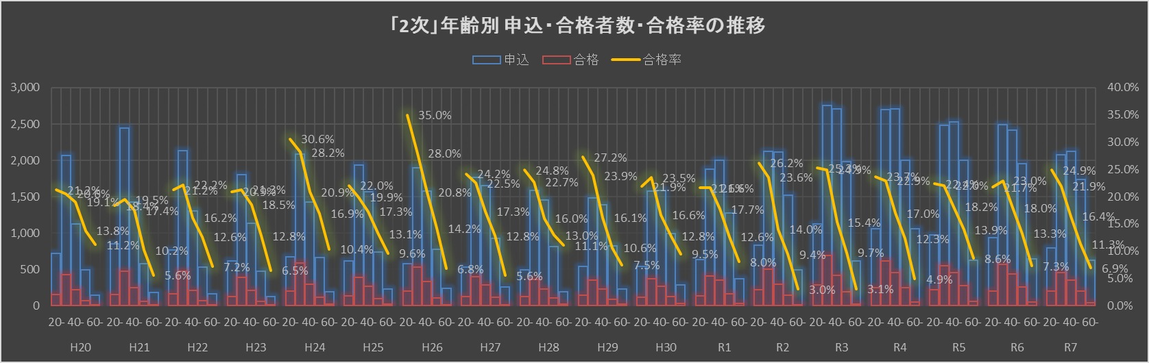 「1次」「2次」の年齢別合格率をグラフ化すると、毎年の傾向が見事に読み取れる。「2次」合格率は定率18%で推移するが、50~60代の「どうみても不合格層」が受け続けるためR7なら20代合格率24.9%、30代合格率21.9%に持ちあがる。20~30代の積極参戦が望ましい。