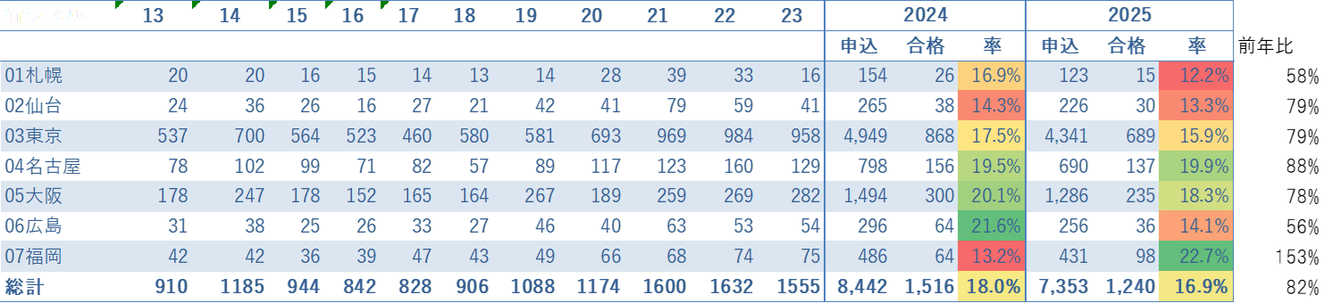 受験者全体の高齢化が進む中、2次合格者の平均年齢が若返りを見せたことは、業界の新陳代謝の観点から極めて好材料です。過去の経験則に囚われず素直に論理を積み上げられる若手の適性が、厳格化された「質」重視の審査基準で証明されました。