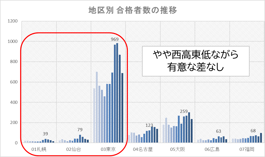 「2次」地区別合格率に有意な差はないが、ここ2年は名古屋・大阪地区合格率が高めになっている。