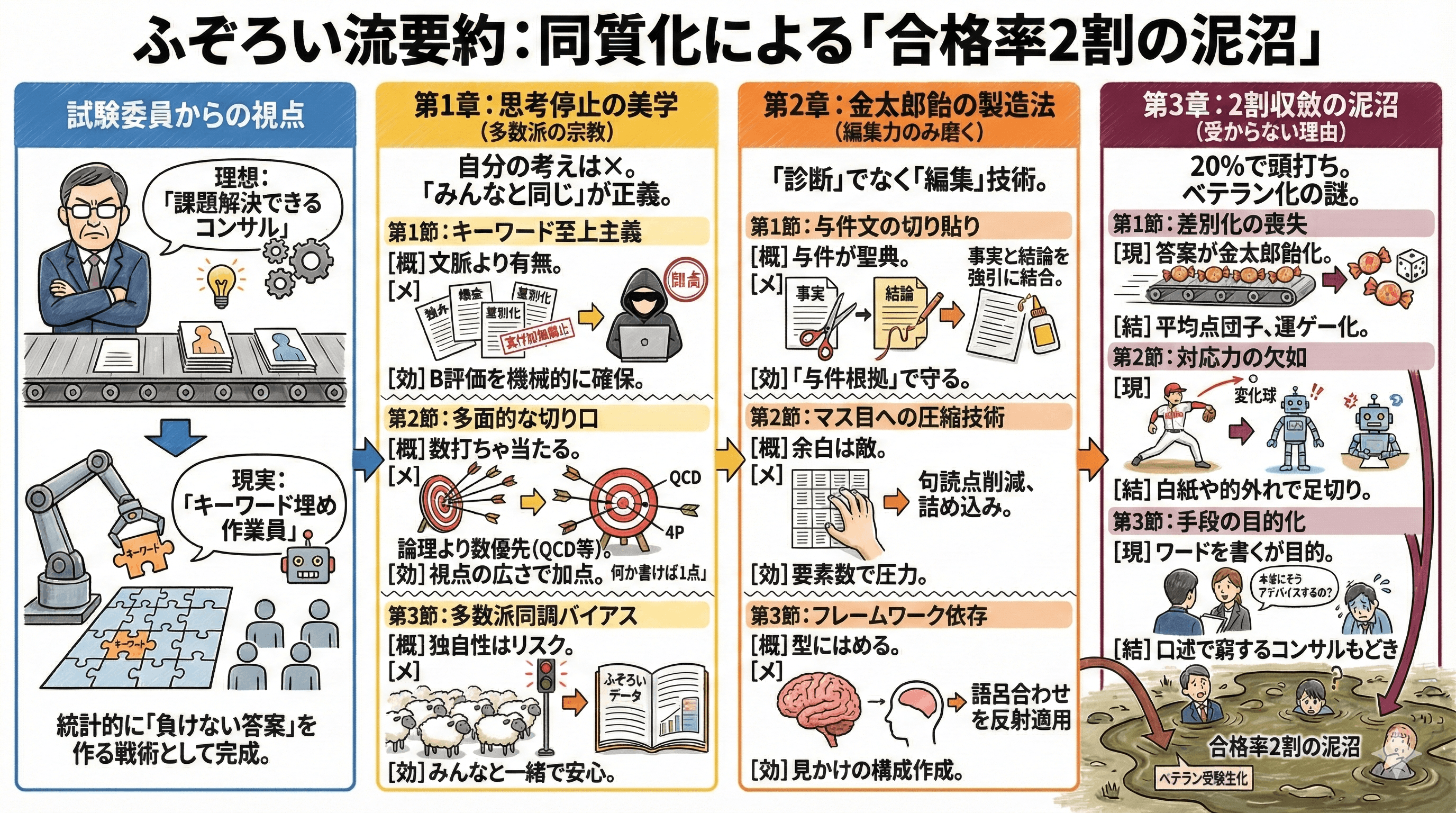 世間で要らないノウハウ!パターン!を叫び散らかし、周囲の答案を自分達に引き寄せる「多数派同質化」を見事達成した隣のふぞろい。それが「必ず8割落ちるリスク」を見届け、その削減に取り組みます。