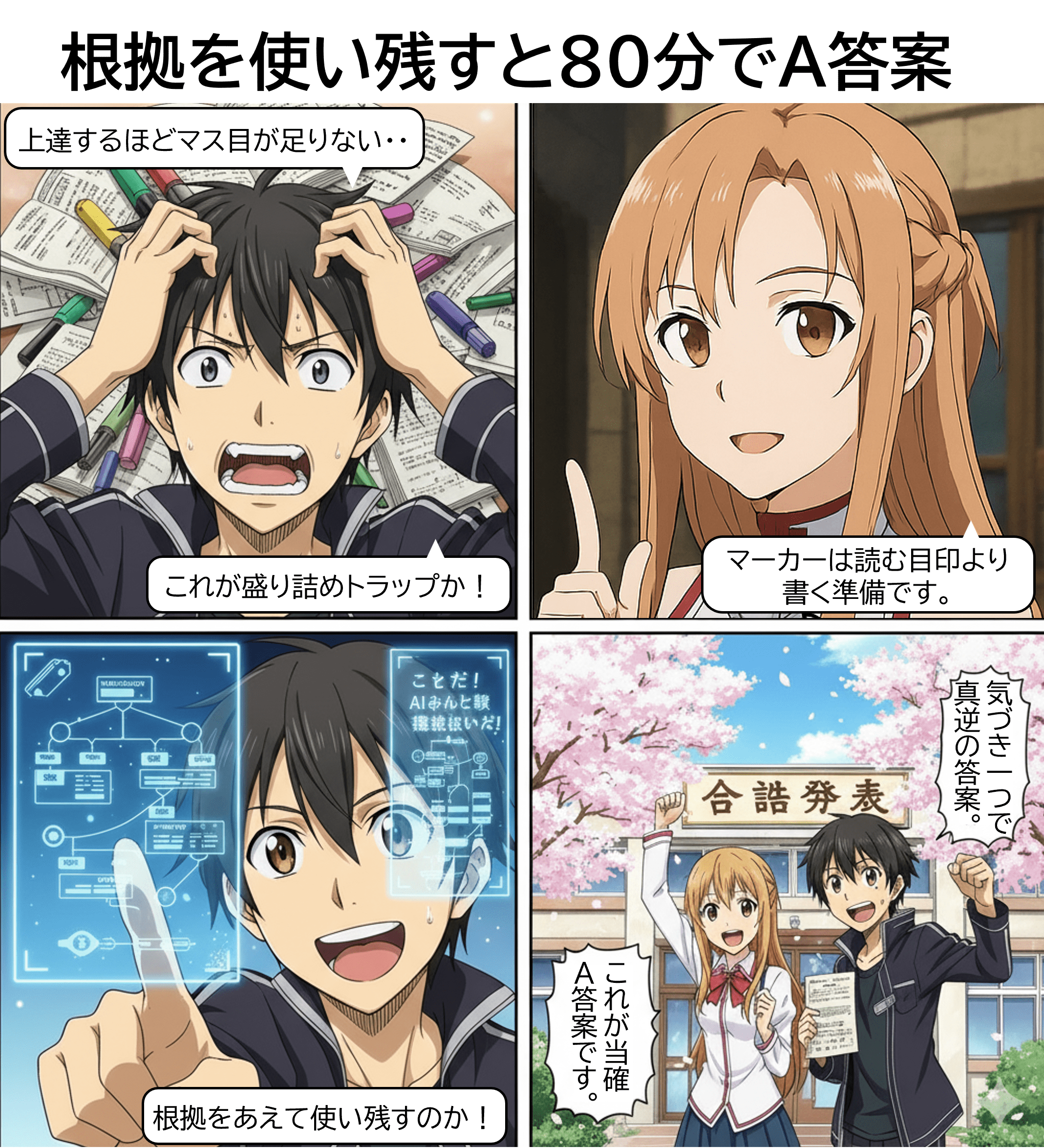 本番では①論理一貫性②根拠の精度でAIを意識し、③自然な表現⑤採点者への伝達力で温かみを出すと、試験委員が思わず頷く当確Aになります。