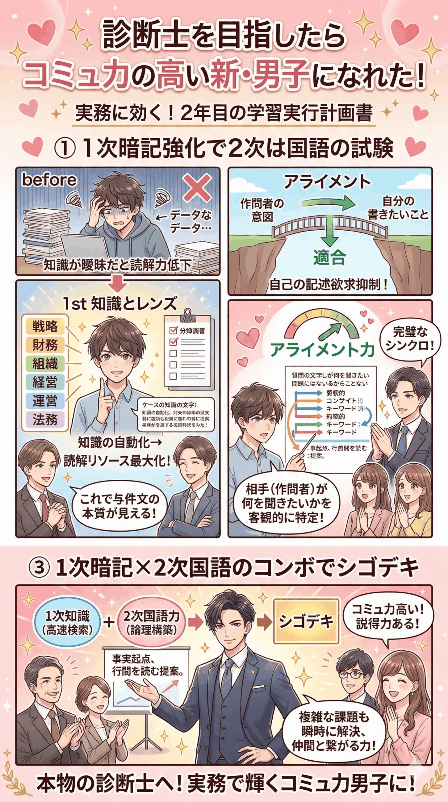 診断士「2次」は2回スベると「1次」強制転移となるが、受験2年目の「1次」再暗記は免除。そこで【2年目の2次対策】では、前年1次で得た「知識と国語」をうまく転用します。