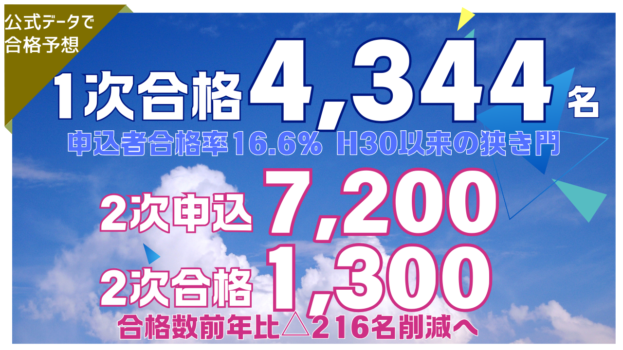 【1次合格4,344名】2次予想:(受験)7,200→(合格)1,300 / 2次合格数前年△216人の狭き門