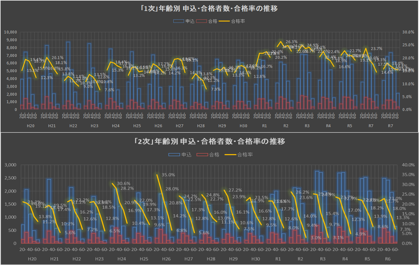 2025年「1次」申込者26,211名は過去最高を更新したのに対し、合格数4,344名は2019年を下回る6年ぶりの少なさで、申込者合格率16.6%は「法務調整」でギリ持ち上げた2018年以来7年ぶりの低さ。
