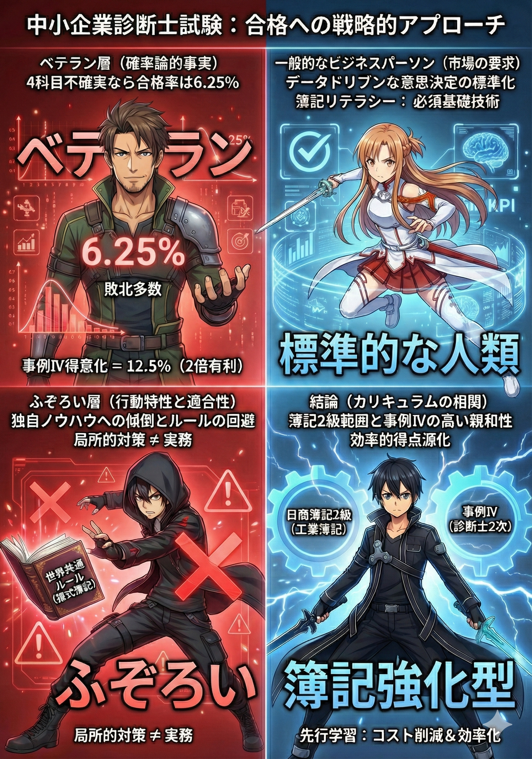 実力も意欲も十分ながら、「事例Ⅳ」の苦手を克服できていない層を指します。運ゲー化した2次とは毎年2割のガチャを引くことですが、Ⅳを正しく学んで安定60点なら合格期待値が倍以上になることを、ムキになって否定します。