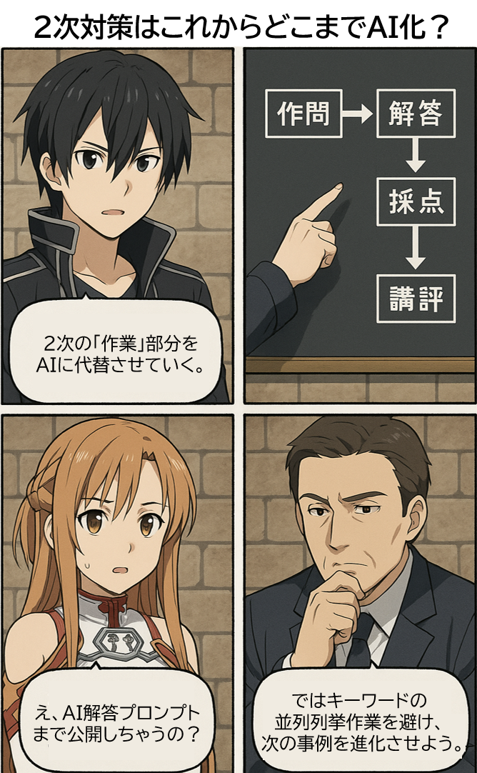 2次対策の「作業」部分はAIに任せて良いと広く認識され、受験者は思考に集中し、試験主催者が願う合格時短が大きく進みだす。