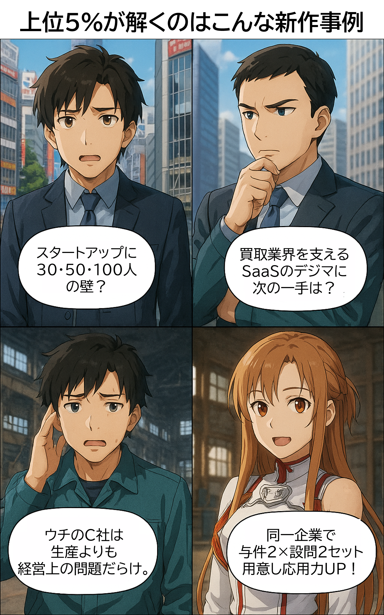 ベンチャーやスタートアップの成長過程で避けられない「30・50・100人の壁」を描き、組織拡大と経営の難しさをリアルに体感。過去問にないテーマを扱うことで、思考を柔軟に切り替える力を養う。
