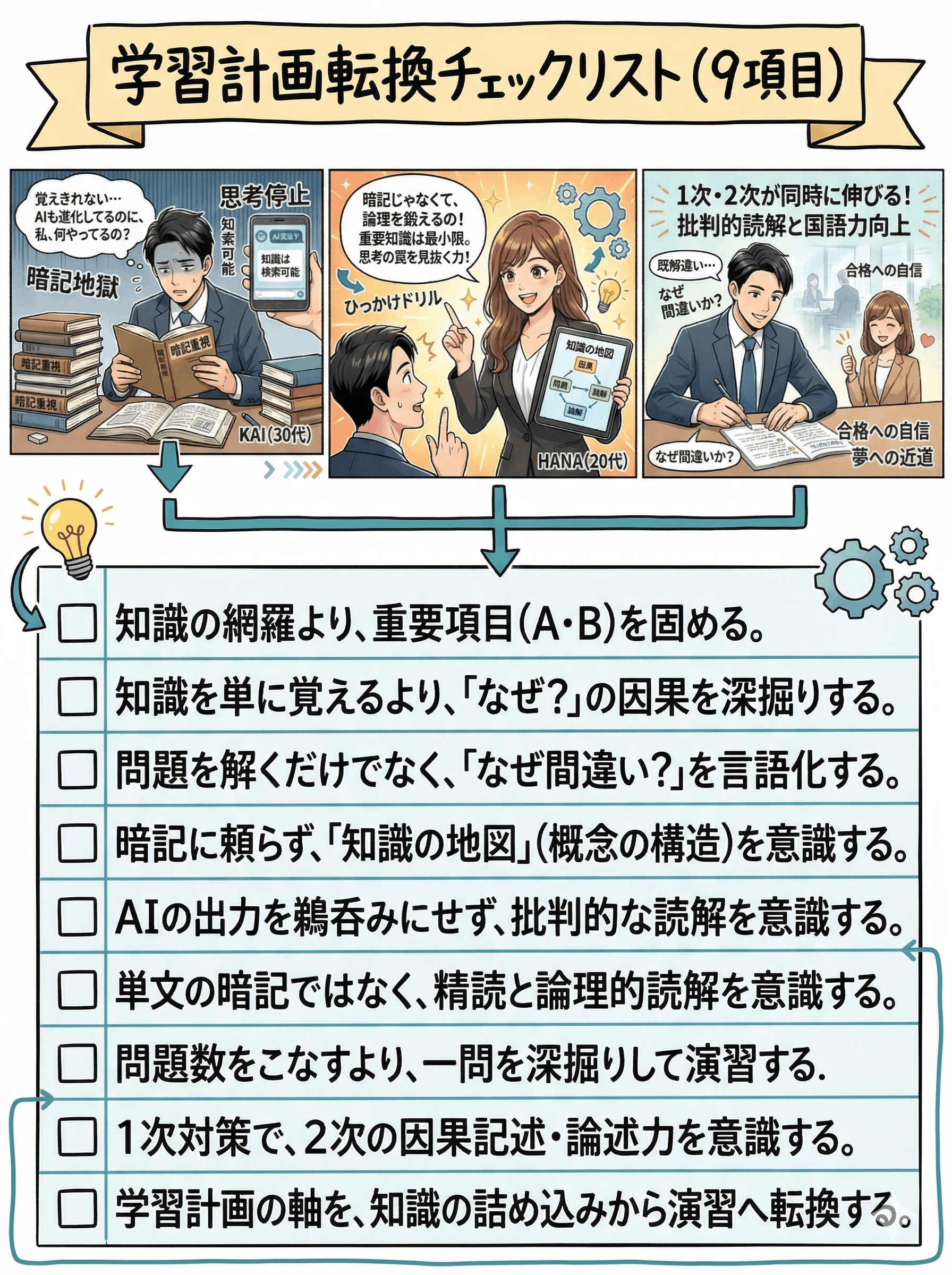 従来の「1次」が7科目の用語を記憶する暗記勝負の量稽古とされたのに対し、AI検索すると知識自体はいくらでも自由に引き出せる時代になったため、これからの「1次」は最低限の暗記による「脳力UP」を前提としつつ、AIのエラーを検知する国語力重視へのシフトを早めます。