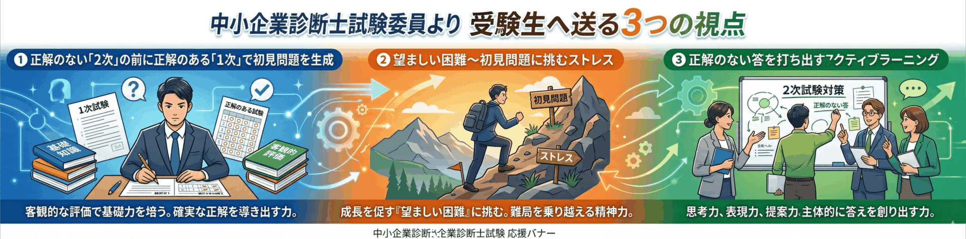 「1次」の類題で初見問題を繰り返すと「まず論点を特定し、そこから論理を組めばよい」という感覚が身につき、「2次」与件文が「解くべき情報が散りばめられたパズル」として見えてくる。