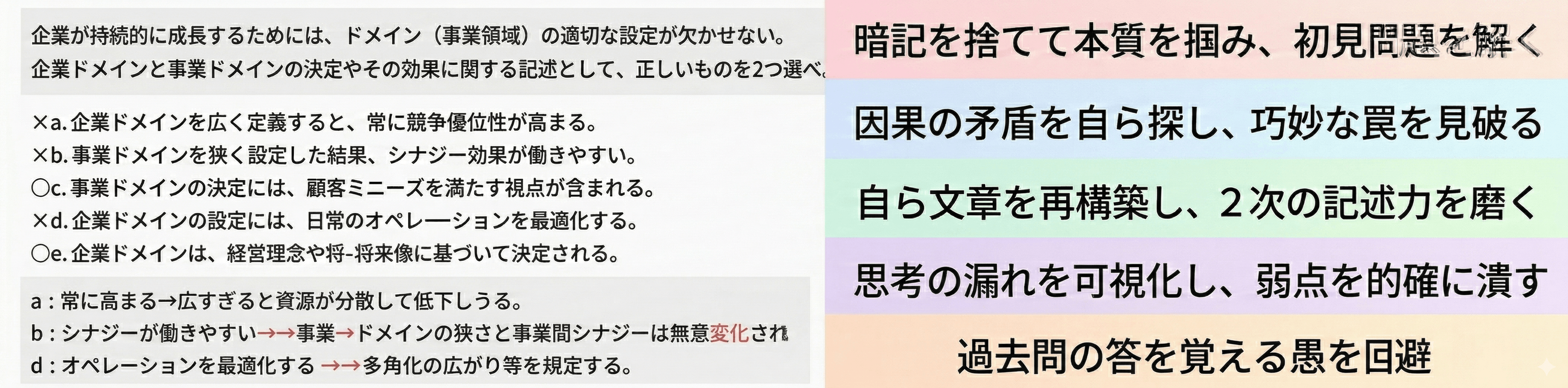 AIに「企業経営理論の競争戦略についてサービス業を題材にした四肢択一問題を3問作成し、各選択肢に正誤の理由を一文ずつ付けてください」と指示するだけで、初見の類題が即座に手に入る。