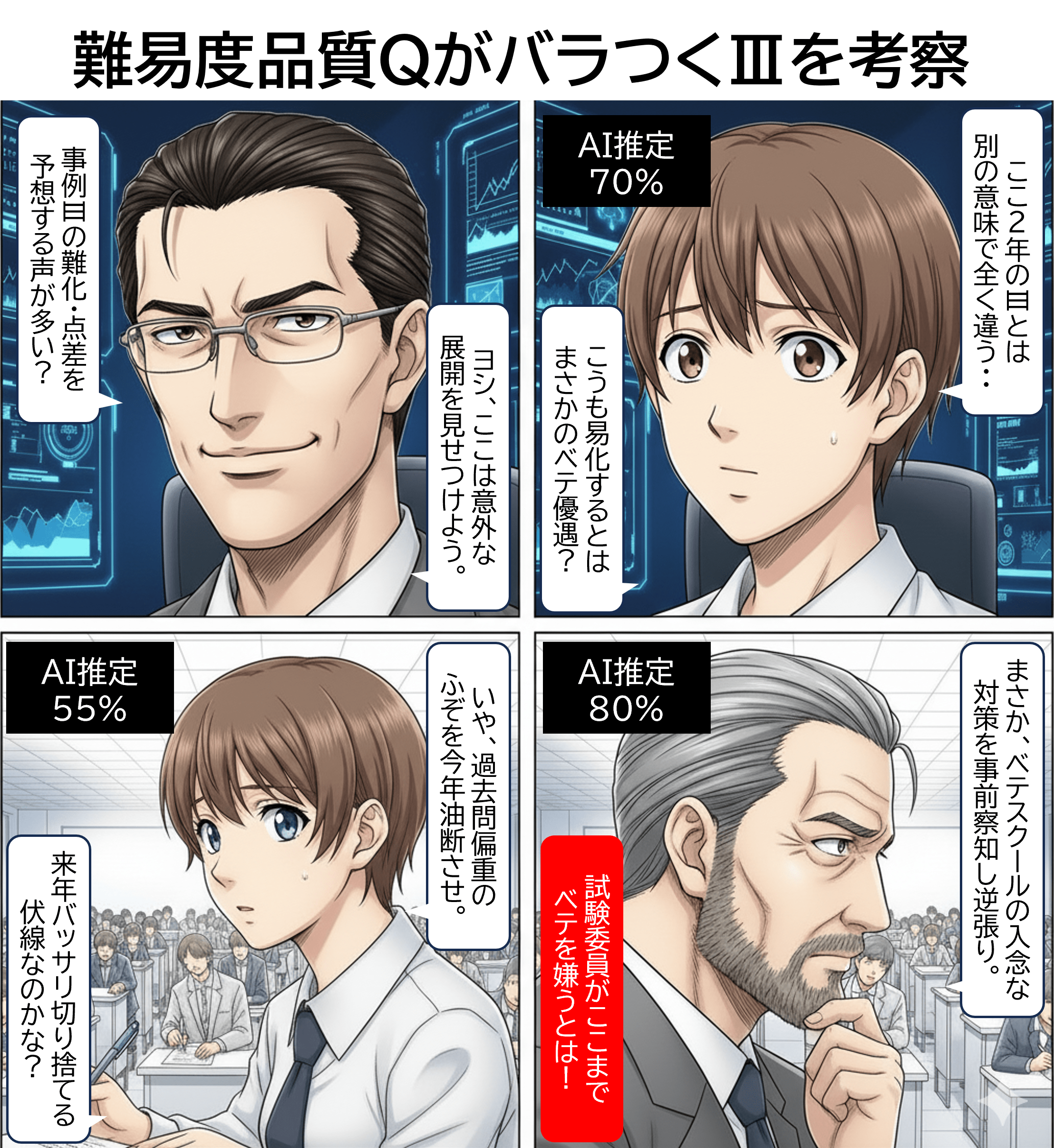 Ⅲが易化し差がつかないとのネット予想を見ながら、試験委員が静かにほほ笑む。