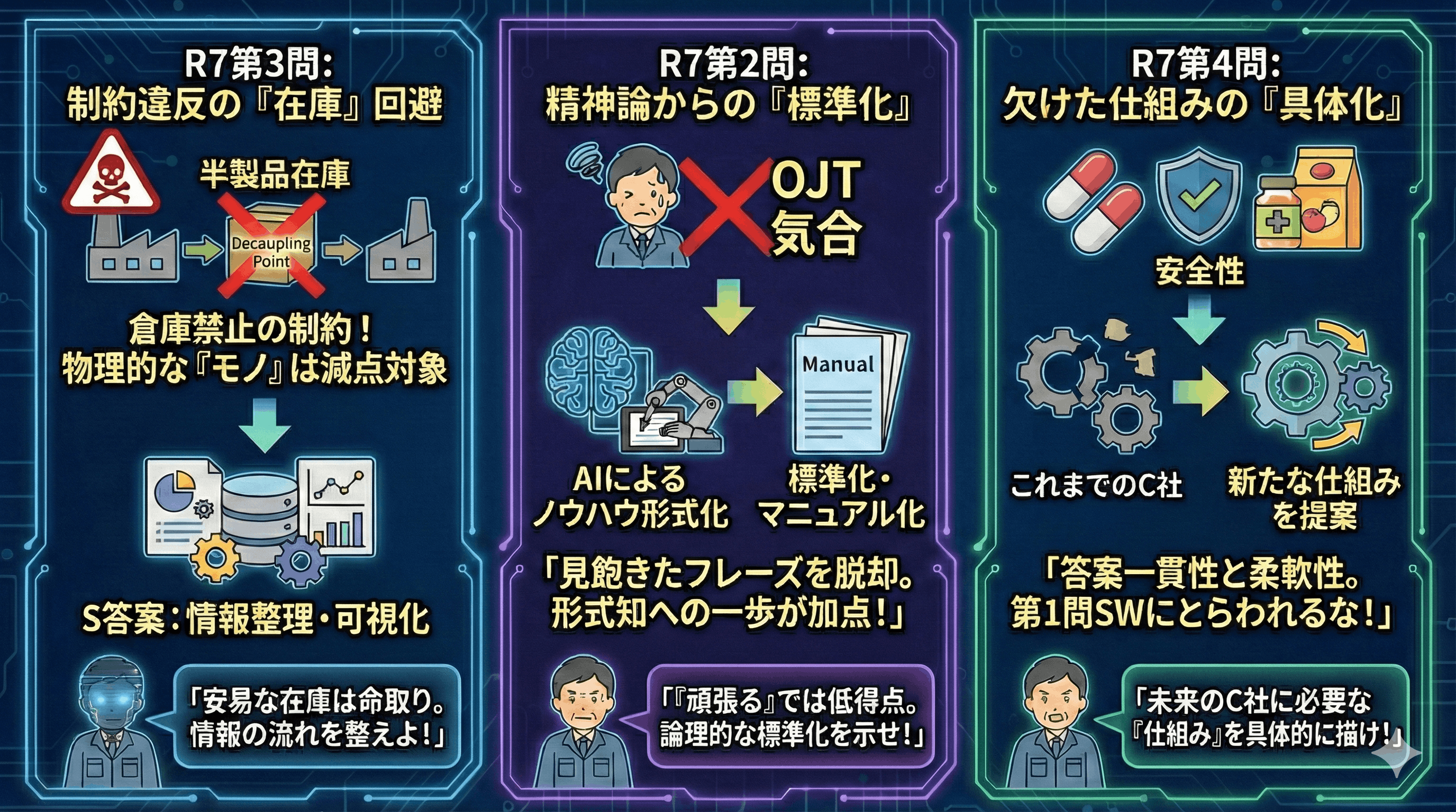 テキストの暗記に終始せず、C社の工場にある「ホワイトボード」や「積み上がった在庫」を脳内で映像化し、そこにある具体的な痛みを感じ取ってください。