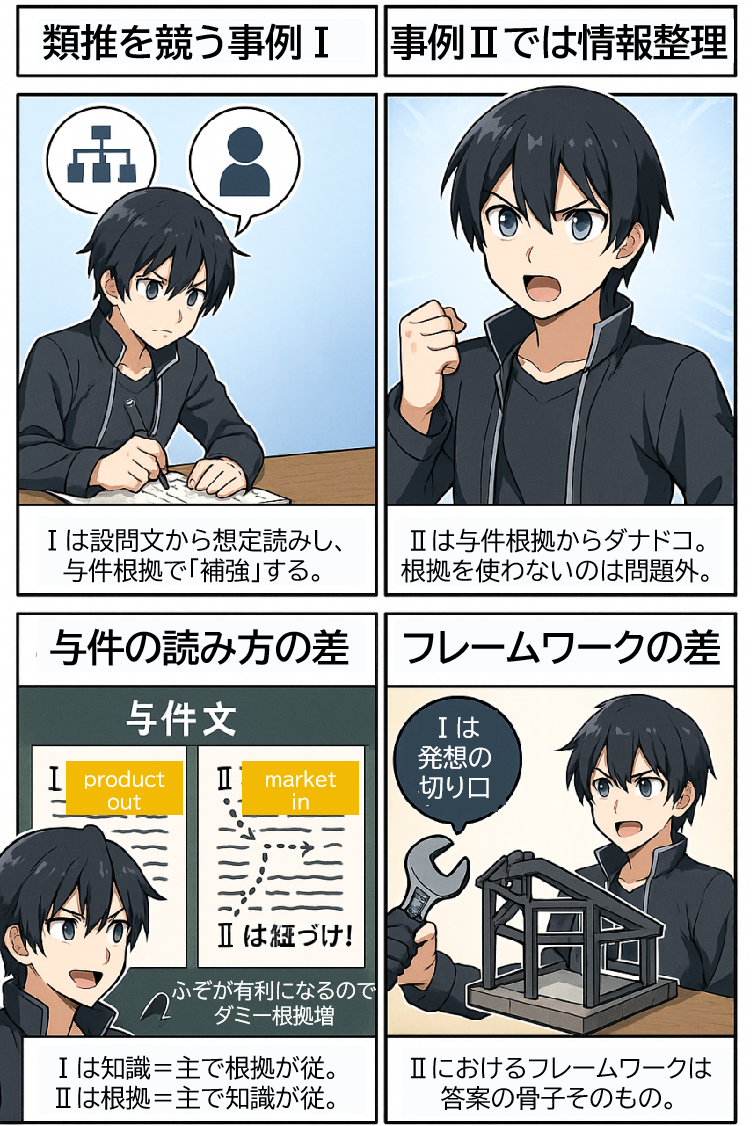 事例Ⅰは「知識主導」で根拠を補う。一方、事例Ⅱは「根拠主導」で知識を従わせる。与件文と設問の対応づけの精度がA答案の決め手に。また与件根拠列挙のふぞが有利になるため、近年は解答に要らないダミー根拠の増加が目立つ。