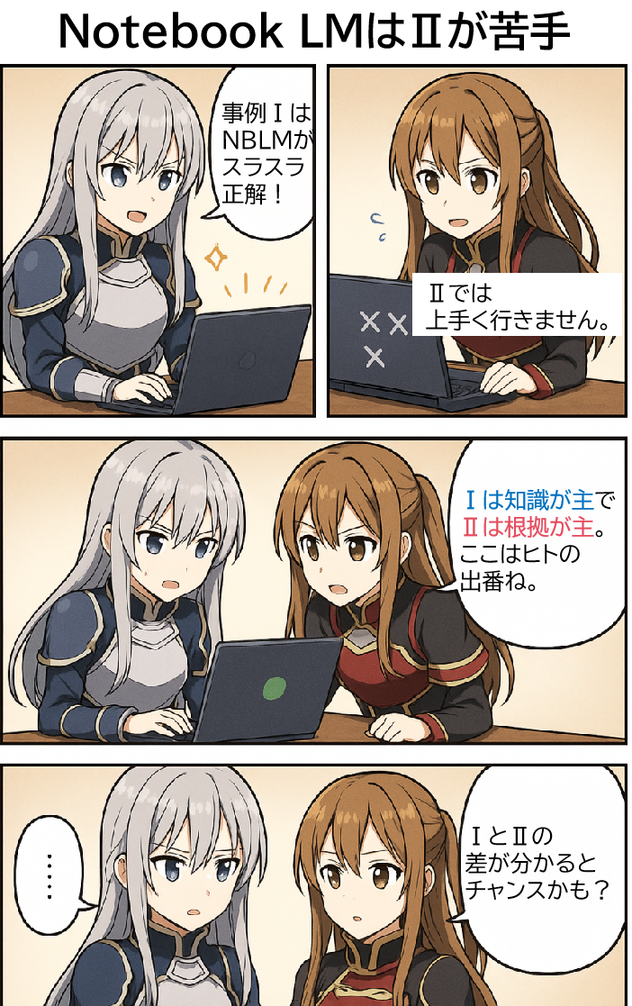「事例Ⅰ」100字×5問を苦も無く正解し、次いで「事例Ⅱ」を解こうとしたNotebook LM。ところが「事例Ⅰ」と「Ⅱ」の違いに大苦戦し、ここはまだふぞろい有利? と疑念視されます。