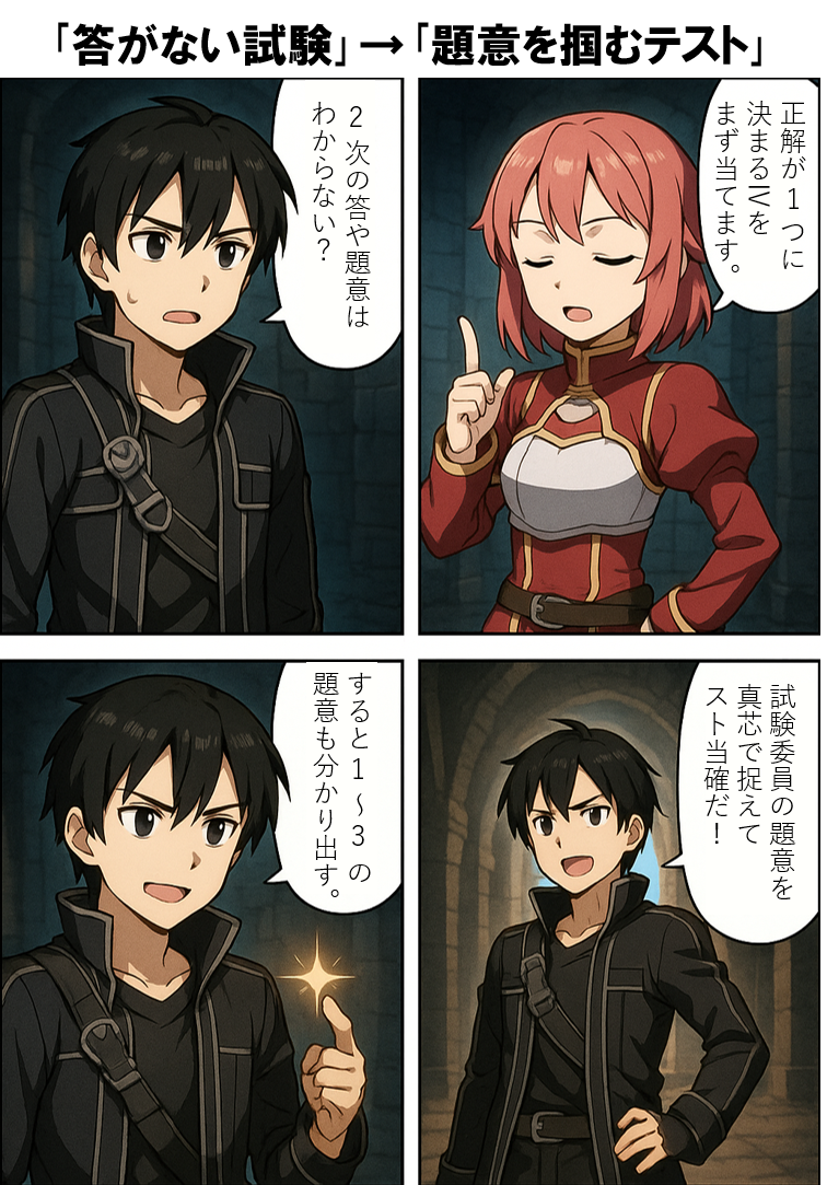 主人公が困惑した表情で「2次の答や題意はわからない?」とつぶやく。これは多くの受験者が抱える、2次=運ゲー出た所勝負な国語の試験という誤解・不安を象徴している。