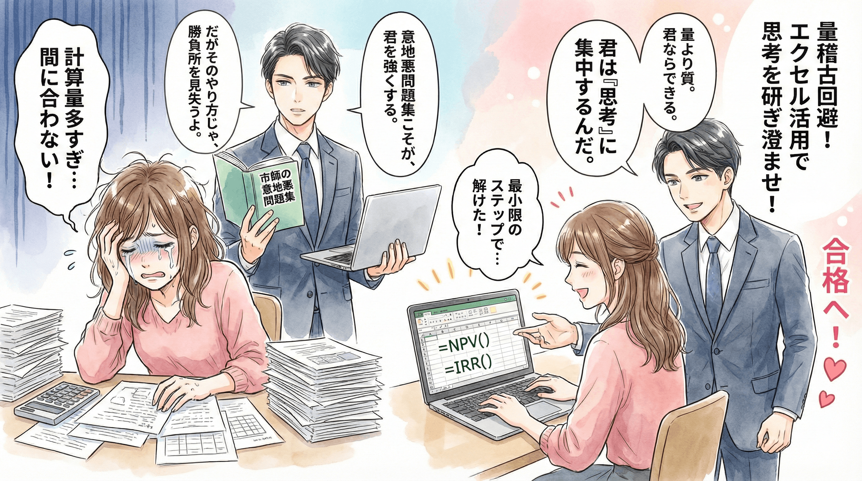 エクセルを活用すれば、冗長な計算過程を最小限に省略し、解答までの最短ルートを構築できます。浮いた時間で設問要求を深く読み解き、論理的で説得力のある解答を組み立てる訓練に充てましょう。