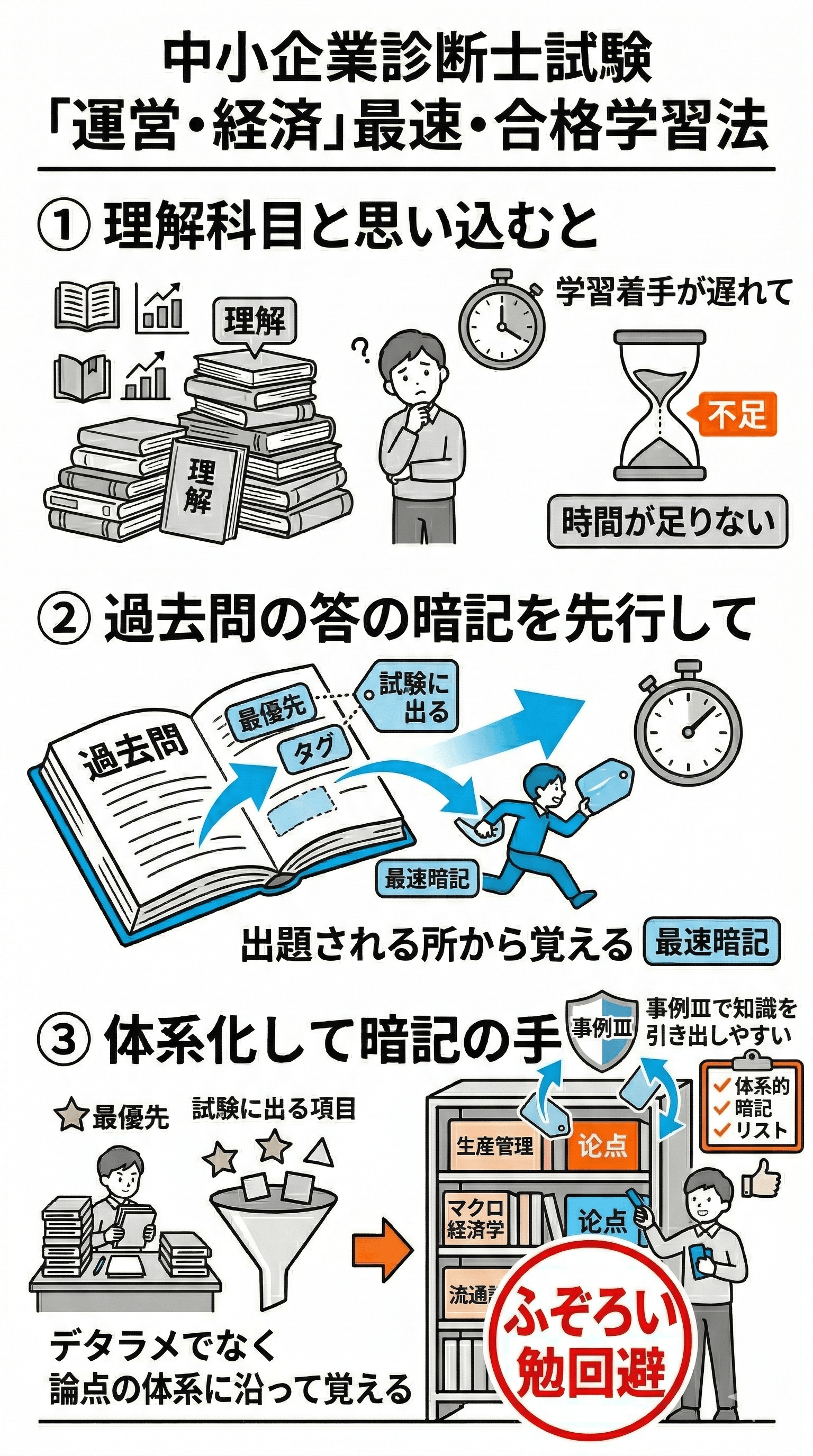 運営や経済学を「理解」から入ると、学問的な深みにはまり、試験に不要な知識まで抱え込むことになりがちです。