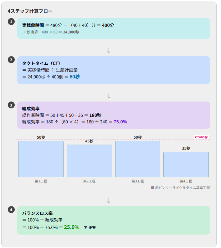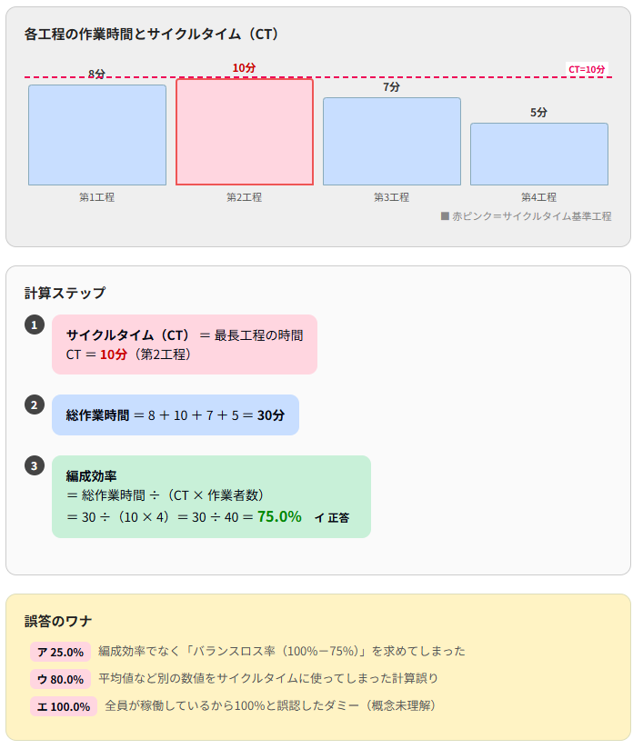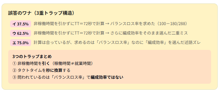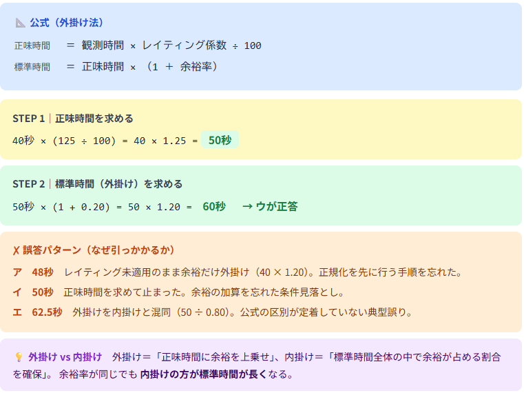 | b(述語ズレ):歩留りの低下は、産出される良品の量が「減少」していることを意味する。 c(修飾語ズレ):設備総合効率は、時間稼働率・性能稼働率・「良品率」の3つを掛け合わせて求める。 d(目的語ズレ):標準時間を設定するのは、遊休時間ではなく「正味時間(または標準作業時間)」を求めるためである。 |