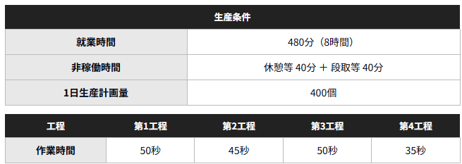 | 1日の就業時間が8時間(480分)の生産ラインがある。以下の条件で算出した タクトタイムをサイクルタイムとしてラインを編成したとき、バランスロス率として最も適切なものはどれか。 |