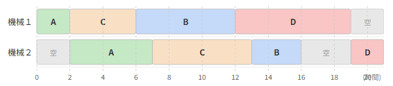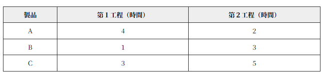 | 2台の機械で第1・第2工程の順に加工する。下表の製品A〜Dをジョンソン法で総所要時間が最小になる順序で投入したとき、2台の機械の非稼働時間の合計はどれか。 |