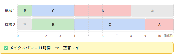 | a(主語・目的語ズレ):オーダエントリー方式は「受注時」に仕様を確定し、半製品に引き当てる方式である。 d(修飾語ズレ):製番管理方式は「個別生産」において、注文ごとに固有の番号を付与して管理する方式である。 e(目的語ズレ):到着順ではなく、納期と設備の空き状況(座席)を照らし合わせて予約・割り付ける方式である。 |
