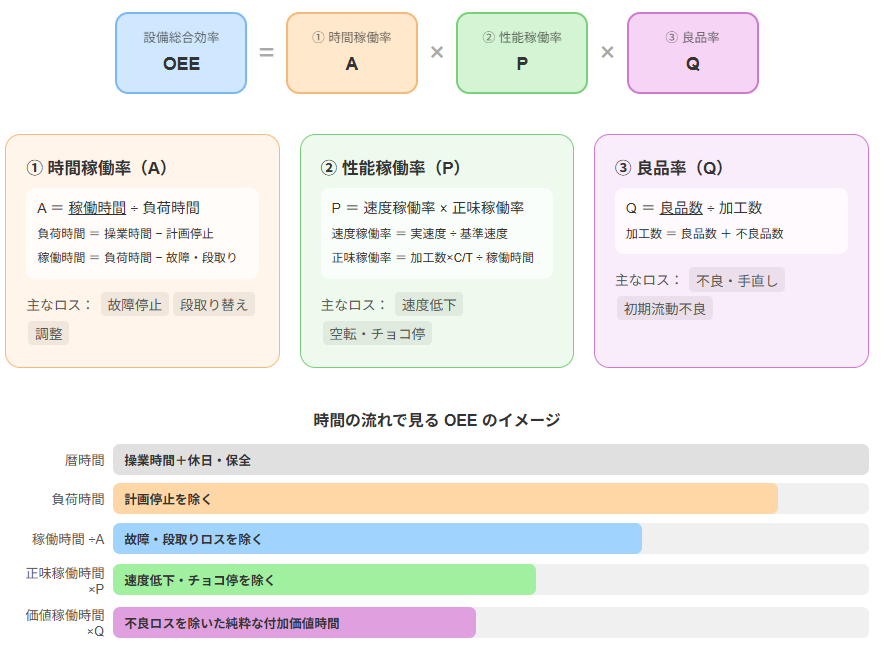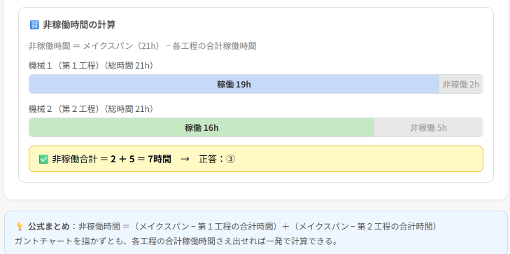 | c(目的語ズレ):性能稼働率は、負荷時間ではなく「稼働時間」で除して求める。 d(目的語ズレ):良品率は、加工数量から不適合品(手直し含む)を引いた「良品数量」の割合である。 e(述語ズレ):設備総合効率は、時間稼働率・性能稼働率・良品率の3つを「掛け合わせて(積で)」求められる。 |