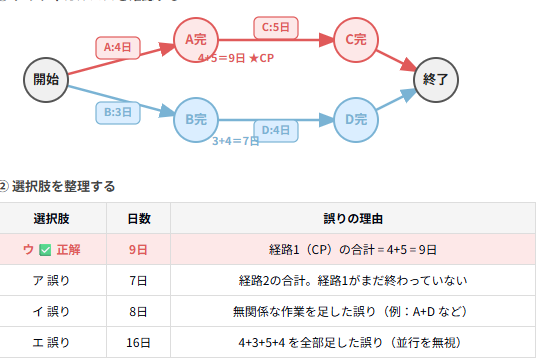 | あるプロジェクトは作業A~Dで構成され、作業A(4日)と作業B(3日)は同時に開始できる。作業A完了後に作業C(5日)が、作業B完了後に作業D(4日)が開始できる。このプロジェクトの最短完了時間はどれか。 |