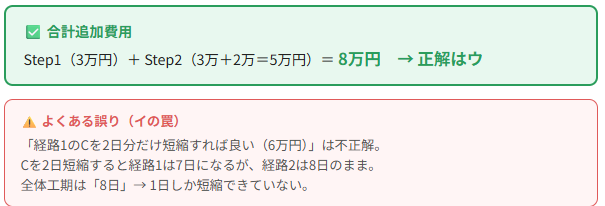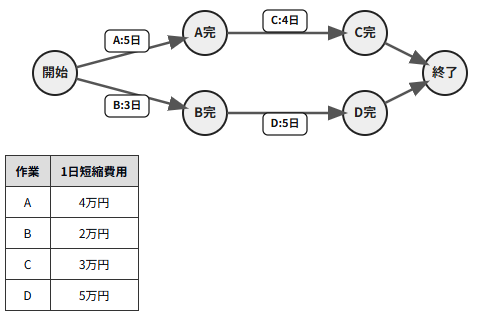 | 経路1(A:5日, C:4日)と経路2(B:3日, D:5日)が並行するプロジェクトの工期を2日短縮したい。1日当たりの短縮費用はA:4万、B:2万、C:3万、D:5万円。最小の追加費用はどれか。(各作業は2日以上短縮可能) |