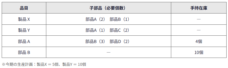 | 以下のストラクチャ型部品表に基づいた記述として、最も適切なものはどれか。 製品 X を 10個 生産する場合を考える。 |