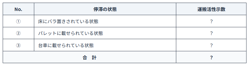 | 運搬活性示数は、対象品が置かれている状態から運び出されるまでに必要な取り扱いの手間数を表す指標である。 以下の表に示す3つの状態における運搬活性示数の合計値として、最も適切なものはどれか。 |