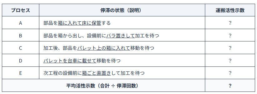 | ある加工職場において、部品の停滞時の状態を調査したところ、以下の表に示す5つのプロセスを経ていることが分かった。 この職場の平均活性示数の値として最も近いものを選べ。 |