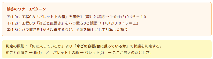 | a(修飾語ズレ):RFIDは電波を用いるため、非金属の障害物があっても複数一括で読み取り可能である。 d(述語ズレ):2次元コードは縦横の二方向に情報を持ち、バーコードよりも情報量が「多い」。 e(修飾語ズレ):1個ずつ管理するのは「シリアル(個体)管理」であり、ロット管理は同一条件で生産された群単位で管理する。 |
