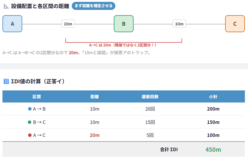 | b(主語ズレ):横軸に製品、縦軸に生産量をとるのは「PQ分析」である。 d(述語ズレ):運搬回数×距離(DI値)が大きい工程は、改善の優先度が「高く」なる。 |