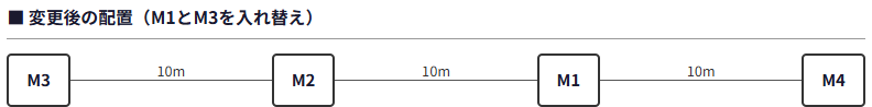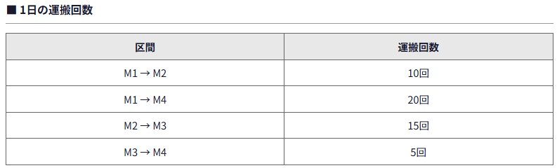 | 以下のレイアウトを変更したとき、変更後の総運搬距離(ΣDI値)として、最も適切なものはどれか。 |
