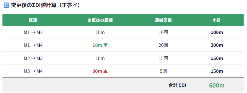 | 以下のレイアウトにおける総運搬距離(ΣDI値)として、最も適切なものはどれか。(→○) |