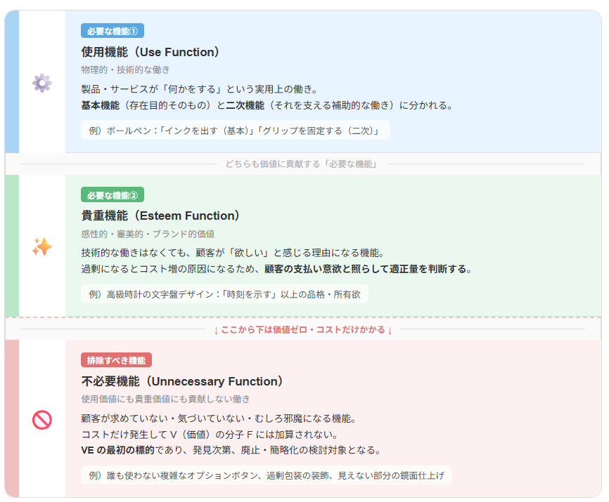 | a(主語ズレ):全く不要な機能は「不必要機能」として扱う。 b(修飾語ズレ):セカンドルックVEは、設計完了後や生産開始後に既存製品に対して行うVEである。 c(主語ズレ):製造上やむを得ず付加される不要な機能は「不必要機能」であり、使用機能は使用目的を果たす機能である。 |
