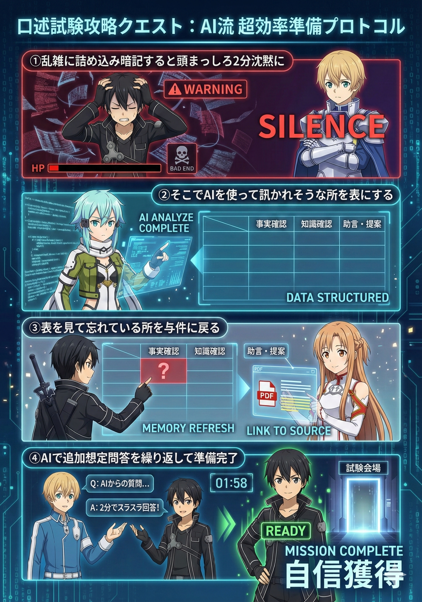 仕上げにAIを試験官に見立て、整理した表に基づいた「オウム返し」の反復練習を行えば、どんな変化球の問いにも動じない鉄壁の対応力が完成します。